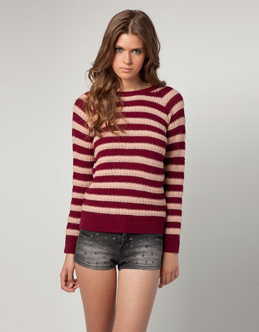 Bardzo ładny, prosty sweterek w bordowo- kremowe pasy.